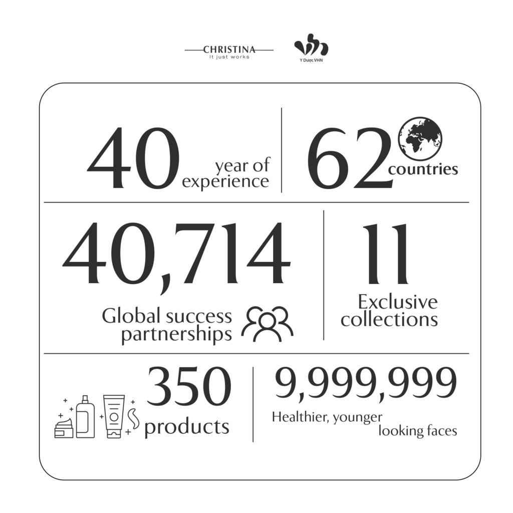 Christina trở thành thương hiệu toàn cầu, phân phối >70 quốc gia trên thế giới với hệ thống >50.000 Bệnh viện, Clinic, Thẩm mỹ viện, Spa. Cho ra đời hơn 300 sản phẩm chăm sóc chuyên nghiệp, đáp ứng tối đa nhu cầu cho nhiều tình trạng khác nhau. Luôn tiên phong trong ngành trị liệu và chăm sóc da, tìm ra các công nghệ, giải pháp chăm sóc da mới, tiên tiến và hiệu quả.