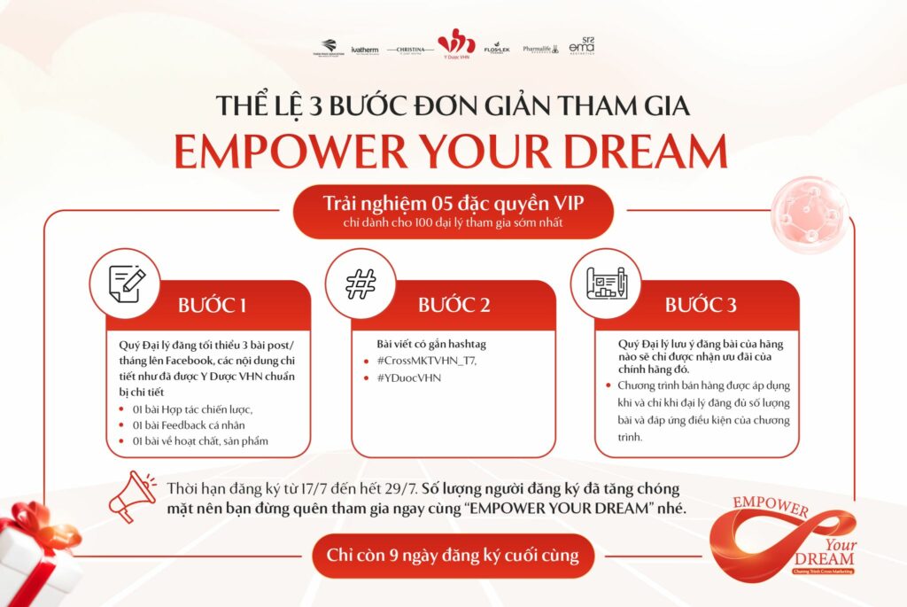 Empower Your Dream là chương trình do Công ty Y Dược VHN xây dựng xuyên suốt trong nửa cuối năm 2023 để giúp khách hàng đại lý giải quyết các bài toán khó nhằn như: