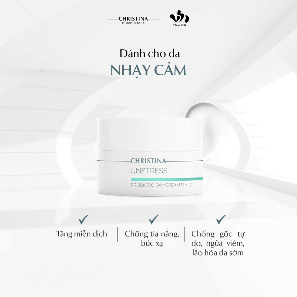 Christina gợi ý cho bạn sản phẩm Probiotic Day Cream SPF 15 đến từ dòng Unstress – Liệu pháp điều trị giúp phục hồi và bảo vệ da. Sản phẩm hoạt động như một lá chắn bảo vệ bằng cách tăng cường hệ thống miễn dịch tự nhiên của da, với công thức chế phẩm sinh học tích cực được làm giàu với các peptide chống oxy hóa thâm nhập sâu, tối đa hóa các cơ chế bảo vệ DNA tự nhiên và chức năng tế bào, giúp duy trì hàng rào bảo vệ da bằng cách khóa ẩm và làm chậm lão hóa sớm do căng thẳng từ môi trường, mang đến làn da khỏe mạnh, mịn màng hơn.