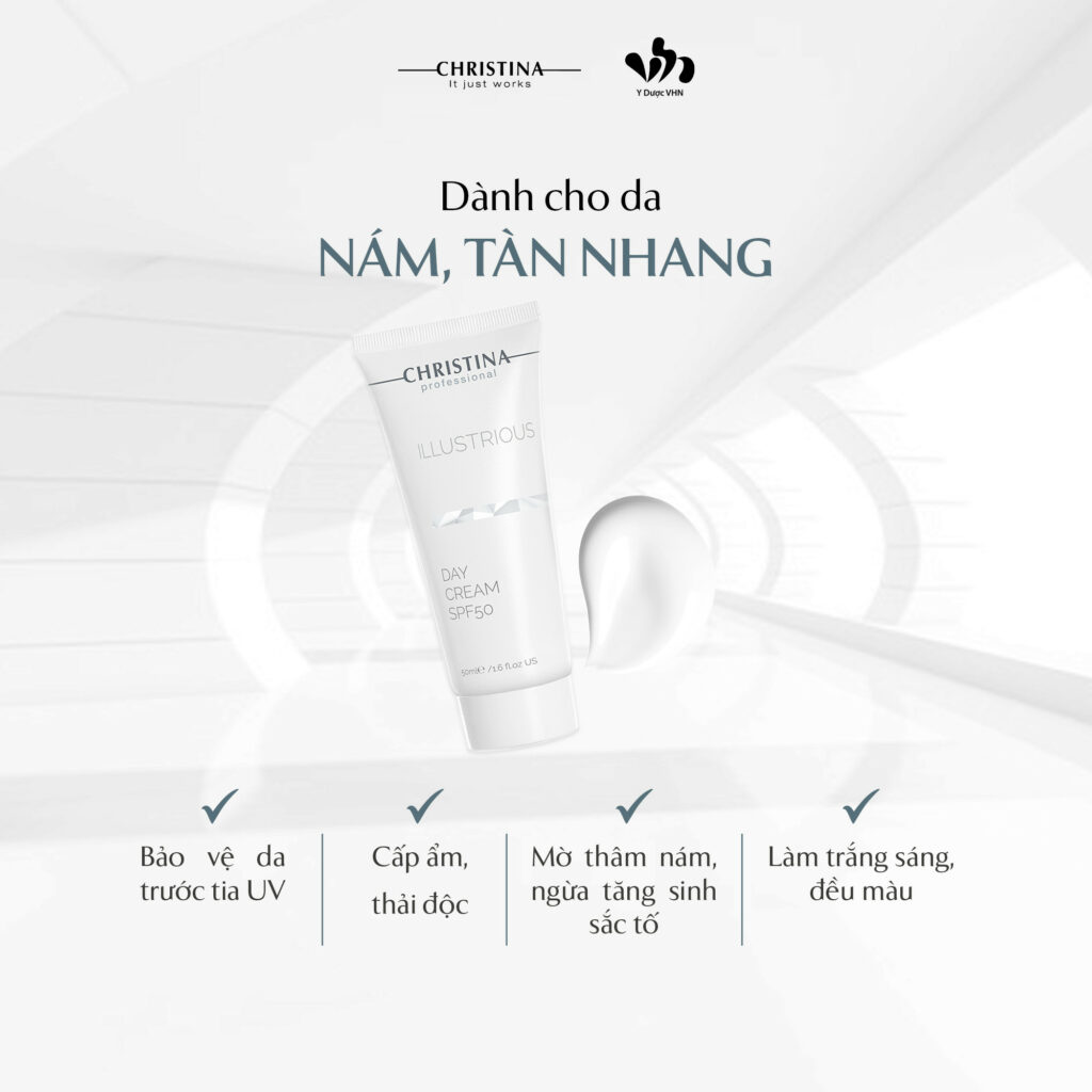 Với làn da nám, tàn nhang thường là do sự tích tụ của melanin trong da, melanin là một chất sản xuất bởi tế bào melanocyte, có chức năng bảo vệ da khỏi tác hại của tia UV. Tuy nhiên, khi sản xuất melanin quá mức, nó sẽ tích tụ trong da dẫn đến sự xuất hiện của nám và tàn nhang. Khi chọn kem dưỡng ẩm phù hợp cho da nám và tàn nhang, bạn cần tìm kiếm các sản phẩm có chứa các thành phần làm sáng da và chống oxy hóa để giảm thiểu sự xuất hiện của nám và tàn nhang. Các sản phẩm này thường chứa các thành phần như vitamin C, glycolic acid, niacinamide và các chất chống oxy hóa. Ngoài ra, việc chọn một loại kem dưỡng ẩm riêng biệt phù hợp với làn da nám, tàn nhang cũng giúp cung cấp độ ẩm cho da một cách tối ưu, giúp làm giảm sự khô và bong tróc của da, đồng thời làm dịu và bảo vệ da khỏi các tác nhân gây kích ứng, giữ cho da khỏe mạnh và tràn đầy sức sống. Day Cream SPF 50 Illustrious là một sản phẩm cực kỳ phù hợp với làn da nám tàn nhang thuộc dòng Illustrious – Liệu pháp trị nám và làm trắng da. Được ví như “áo giáp” bảo vệ da mặt với công nghệ chống nắng mới giúp tăng khả năng phòng thủ UVA + UVB phổ rộng, Whitening Peptide ức chế enzym tham gia vào sản sinh melanin, làm sáng và mờ thâm nám hiệu quả, HA và Niacinamide có tác dụng dưỡng ẩm, chống oxy hóa, mang lại một vẻ ngoài đầy tươi sáng.