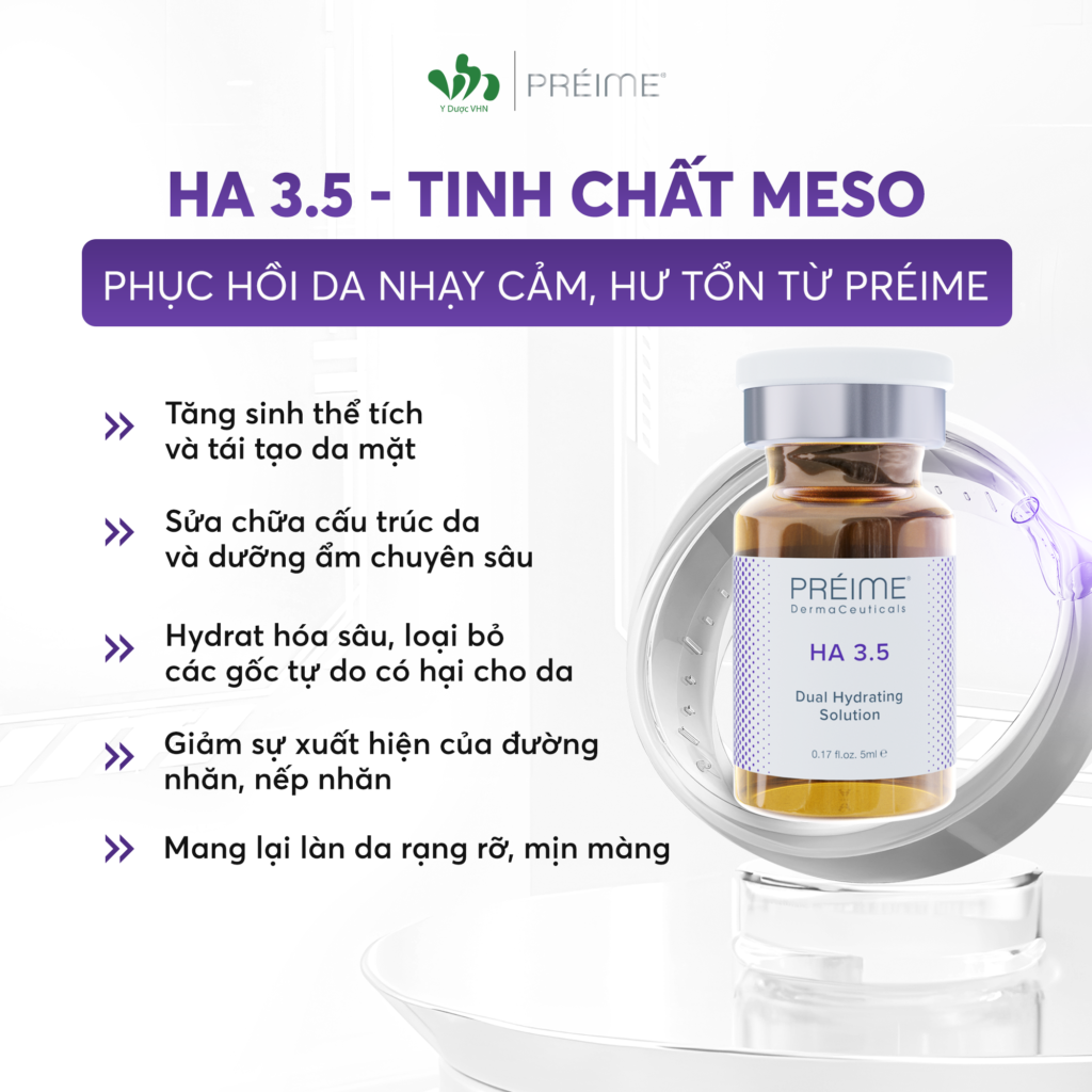 Hiện nay, Meso phục hồi đang là một trong những liệu pháp được ưa chuộng nhất tại các BV da liễu/ Spa/ TMV/ Clinic với ưu điểm HIỆU QUẢ CAO, AN TOÀN, LIỆU TRÌNH NGẮN, PHỤC HỒI TOÀN DIỆN. Trong đó, HA 3.5 của Preime là một trong những hoạt chất phục hồi “không thể bỏ qua” bởi các công dụng: