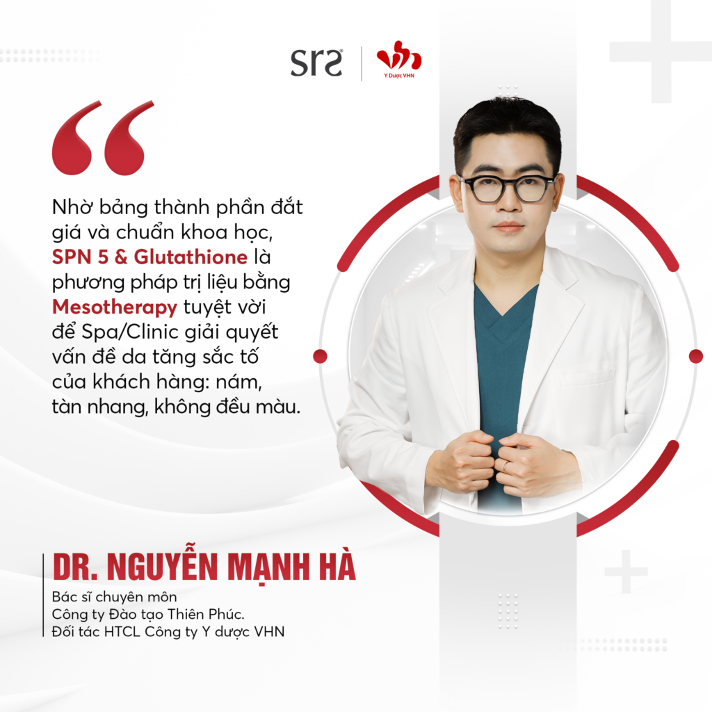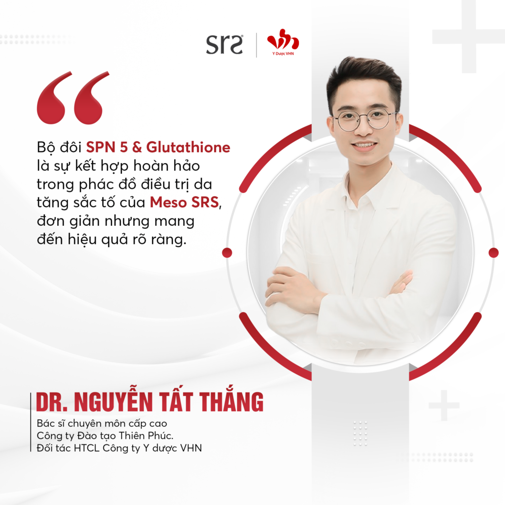 - SPN-5: nằm trong nhóm sản phẩm đột phá của thương hiệu Meso SRS. Đây là một loại cocktail thẩm mỹ đặc biệt với công thức PDRN – loại DNA chiết xuất từ tinh hoàn cá hồi, hỗ trợ tái tạo và trẻ hóa làn da, cải thiện tình trạng nếp nhăn và các dấu hiệu lão hóa, mang lại cấu trúc da khỏe mạnh, đàn hồi tốt, nâng cơ và chống oxy hóa mạnh cho làn da.