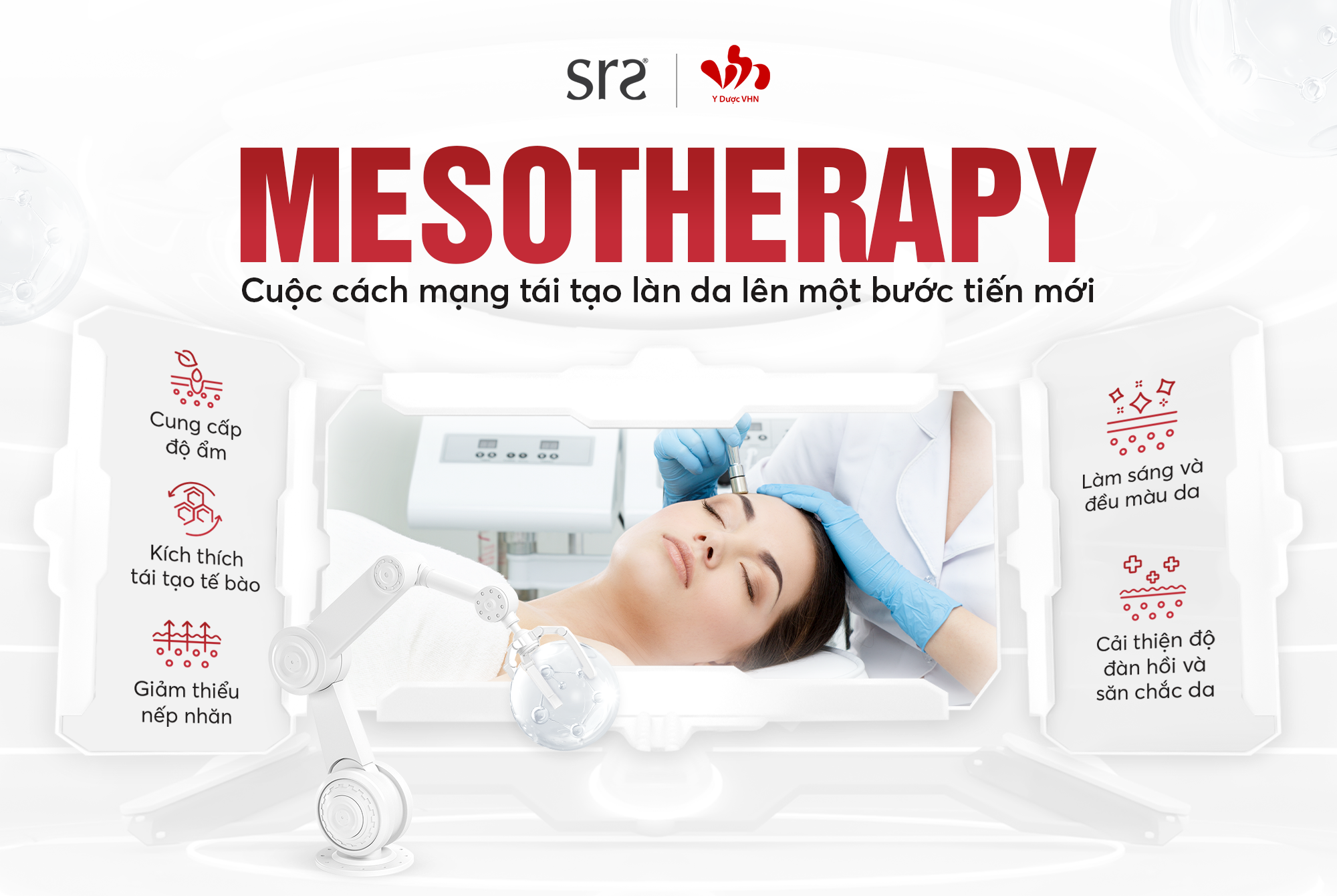 Với bộ sản phẩm Skin Lift, Skin Renew, SPN-5, Collagen Booster, Hyaluronic Acid 3.5%, SRS Mesotherapy có thể tiếp cận tới lớp da chùng nhão ẩn sâu bên trong, tái tạo da từ gốc, bằng cách cấy trực tiếp các dưỡng chất vào tầng trung bì của da, thúc đẩy sản xuất collagen, elastin và kích thích sự trao đổi chất của làn da.