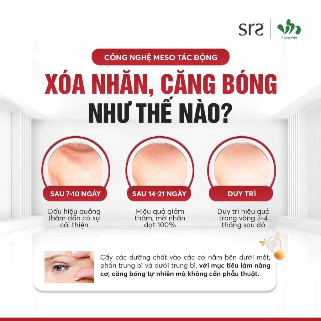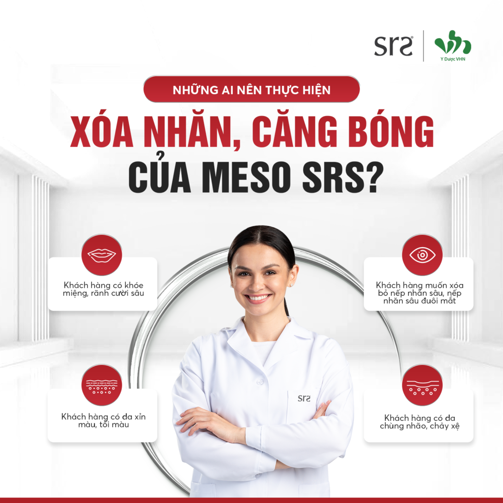 Da mặt xuất hiện các dấu hiệu lão hoá như vết chân chim, chùng nhão, chảy xệ hay kém săn chắc,… thì dịch vụ meso NÂNG CƠ – CĂNG BÓNG – XOÁ NHĂN từ Meso SRS chính là giải pháp mang đến cho khách hàng vẻ ngoài tươi trẻ hơn chỉ sau 01 liệu trình được can thiệp.